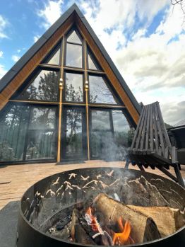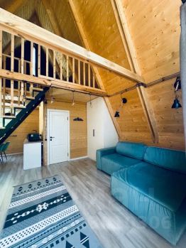 Каждый дом a-frame рассчитан на проживание до 4-х человек, имеет кухню-гостиную, спальню на втором этаже, санузел.