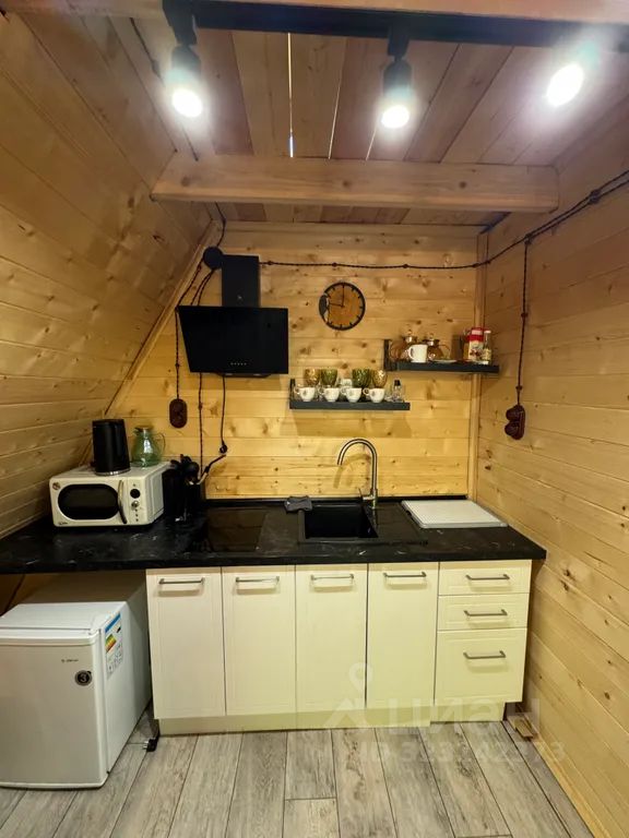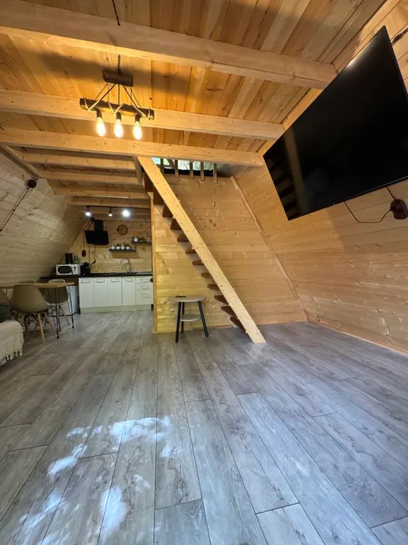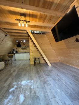На территории комплекса 3 домика афрейм. Каждый домик рассчитан на 6 гостей. В домике есть все для вашего удобства. На втором этаже спальня и 2 двуспальные кровати, не изолированные, на 4х гостей. В коттедже собственная ванна, где имеются все косметические принадлежности, гостиная и полностью оборудованная кухня. В гостиной есть диван на 2х гостей. Так же имеется система "тёплый пол" на всем первом этаже. Домик двух этажный.