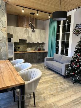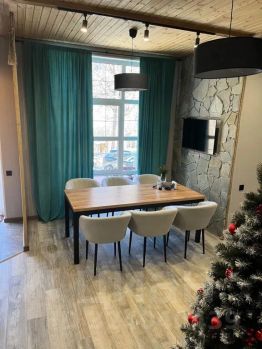 Премиальный Гостевой Дом в светлых тонах сочетает современный стиль с природным уютом: просторная гостиная с большим окном, комфортная обеденная зона и дизайнерская мебель создают эффект настоящей зимней атмосферы. В спальне уютная двуспальная кровать и распланированное освещение для отдыха, а современная ванная со стиральной машиной обеспечивает удобство для длительного проживания. Кухня оснащена всем необходимым, включая кофемашину, микроволновку, набор посуды и удаленную рабочую зону, а гостям приятно отдыхать у новогодней ели.