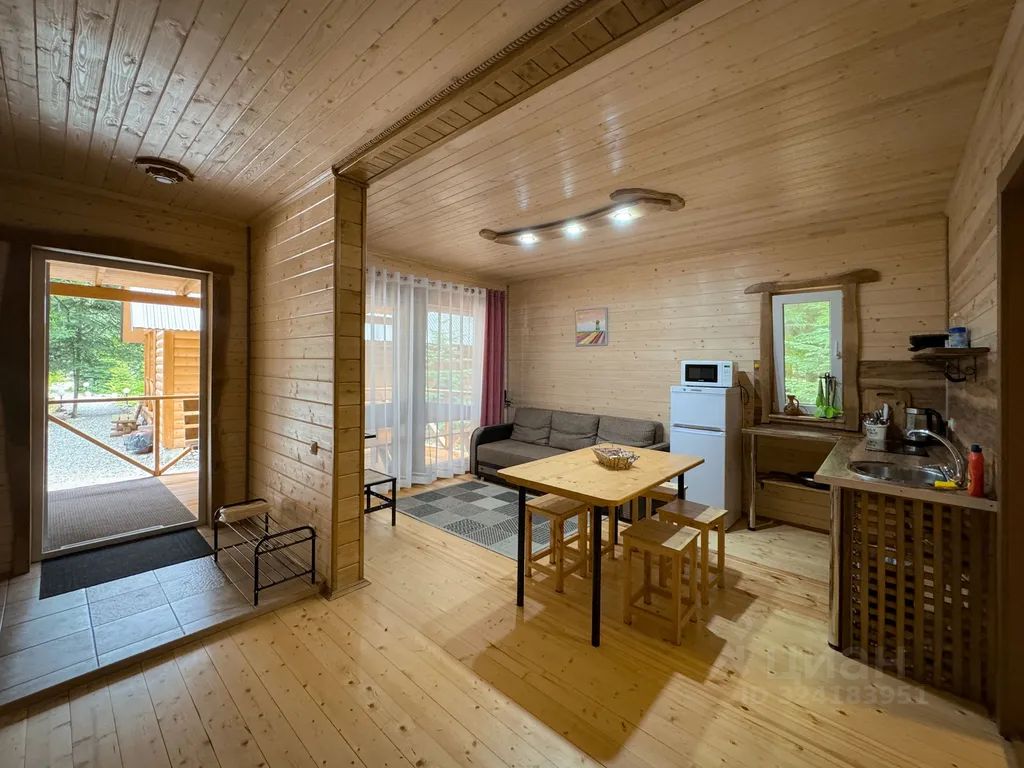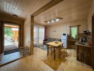 Шале с двумя изолированными спальнями; Площадь дома 70 кв. м.; Две спальни с двуспальными кроватями; Кухня-гостиная с раскладным диваном; Кухонный гарнитур со всей необходимой посудой и техникой; Варочная поверхность; Холодильник; Телевизор; Электрочайник; СВЧ печь; Набор посуды; Санузел с душем; По два полотенца на каждого гостя; Одноразовые тапочки; Шампунь/гель для душа, зубной набор, жидкое мыло.
