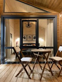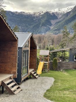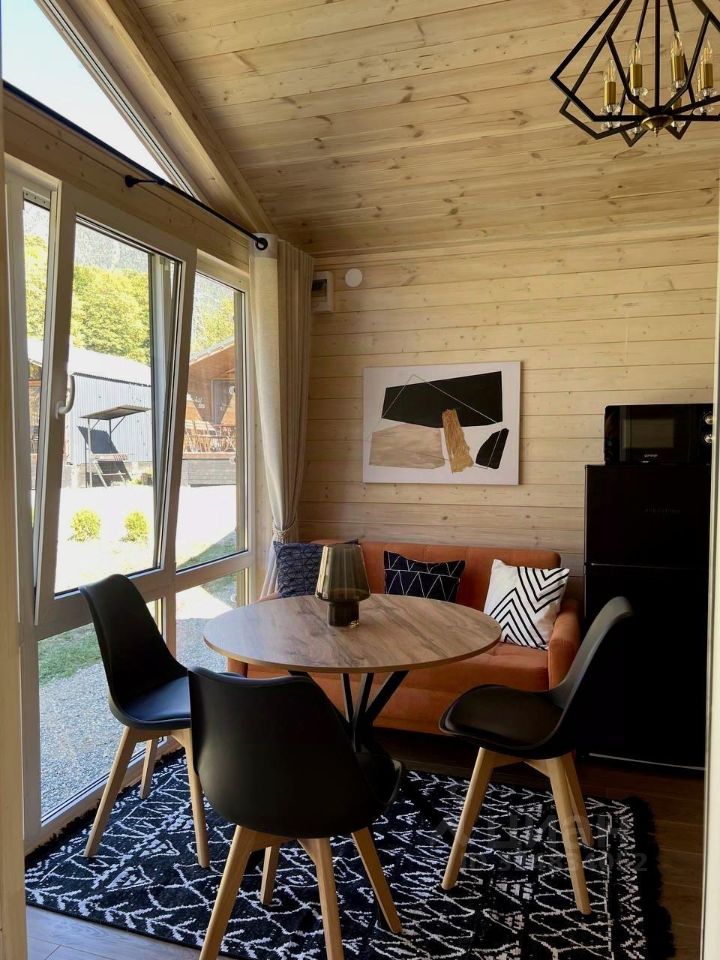 Зона приготовления пищи отвечает запросам самых требовательных гостей, в домике предусмотрены: большой холодильник, микроволновая печь, варочная панель, удобная зона для хранения посуды и современная мойка.