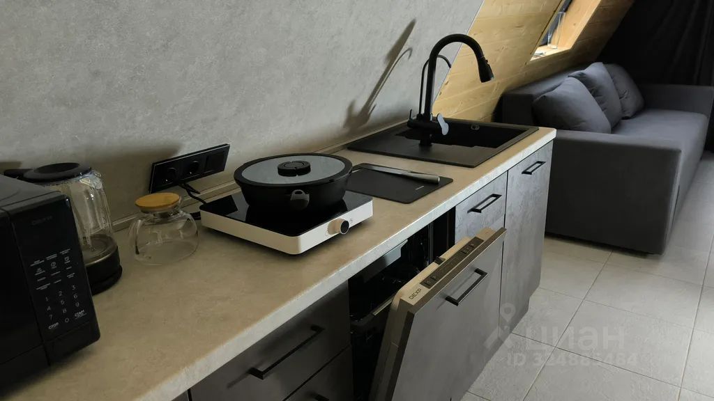 - Кухонная зона полностью оборудована: индукционная плита на одну конфорку, микроволновка, посудомоечная машина, холодильник с морозильной камерой, электрочайни