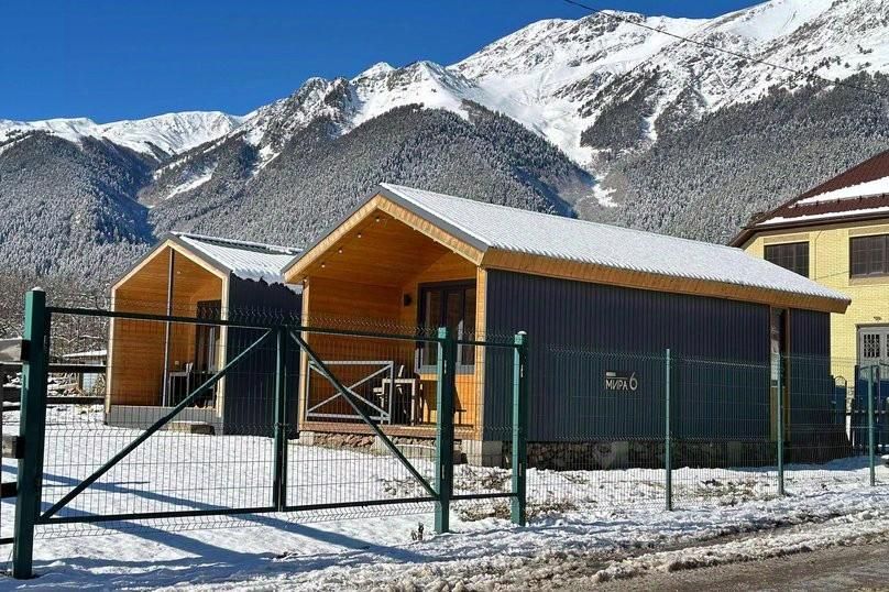 В доме 2 комнаты: спальня с двуспальной кроватью и кухня-гостиная с двуспальным диваном, обеденной зоной и TV.