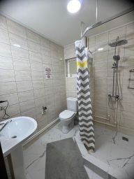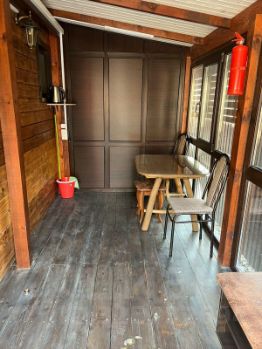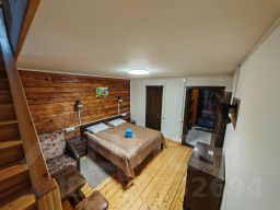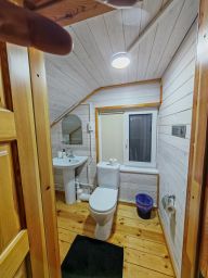 Двухуровневый домик с террасой, в номере большая двуспальная кровать, удобный диванчик, душ и туалет на первом этаже, большой диван, 2 односпальные кровати и туалет на втором этаже, ТВ на обоих этажах, холодильник, чайник, WiFi, тёплый пол, кухня-столовая в соседнем здании со всем необходимым для готовки и ТВ
