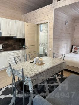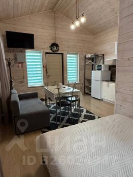 Коттедж представляет собой студию с двуспальной кроватью, диванчиком и кухонной зоной. Кухня оснащена всем необходимым для приготовления пищи.