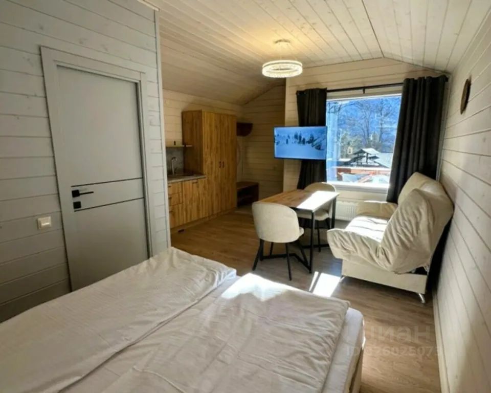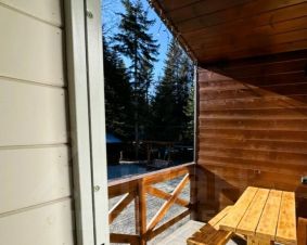 Домик предназначен для размещения от двух до четырёх человек. Расположен в лесной зоне, из окон и с террасы открывается вид на деревья и горы.