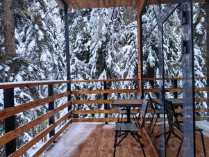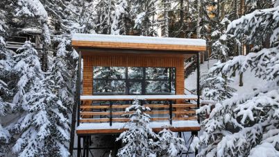 Коттедж Трио 18 — это дом площадью 32 м² с панорамными видами на реку, горы и лес. Его терраса буквально парит над пропастью, открывая захватывающий вид на изгиб реки и бесконечный лес. Постоянный звуковой фон — умиротворяющий шум воды внизу.