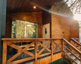 Домик предназначен для размещения от одного до восьми человек и расположен в лесной зоне, среди деревьев.