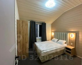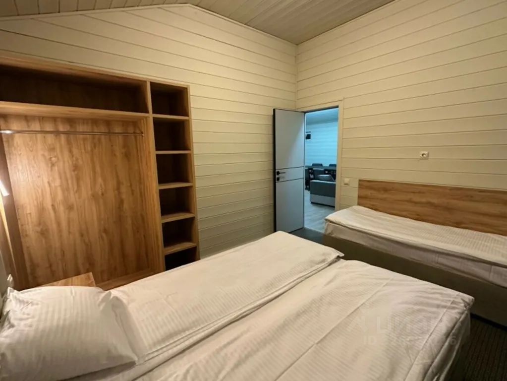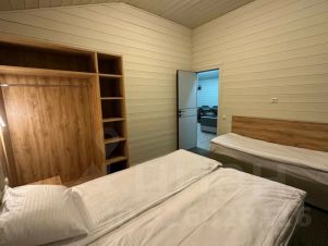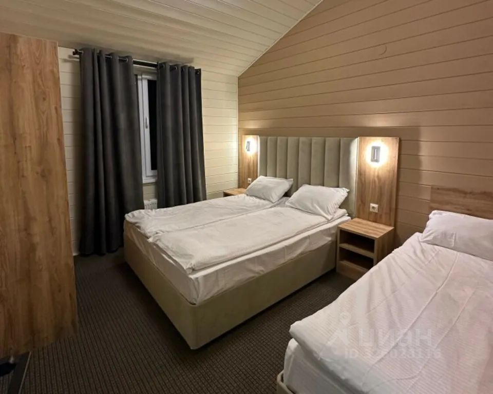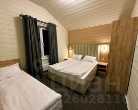В домике три отдельные спальни. В спальнях — двуспальные и односпальные кровати, прикроватные тумбы, шкафы, окна с видом на лес.