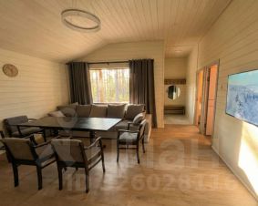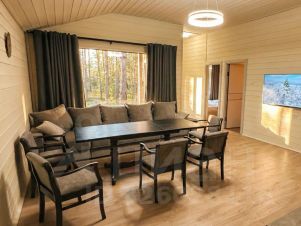 Гостиная объединена с обеденной зоной: большой обеденный стол, мягкий угловой диван, кресла, телевизор. Большие окна с плотными шторами, вид на лес.