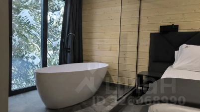 Коттедж Квадро 12 — дом 50 м² для размещения до 4 гостей, с ванной у панорамного окна в спальне и террасой на крыше.