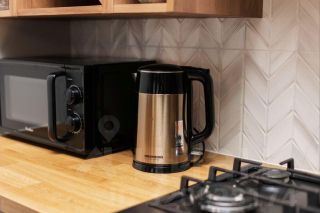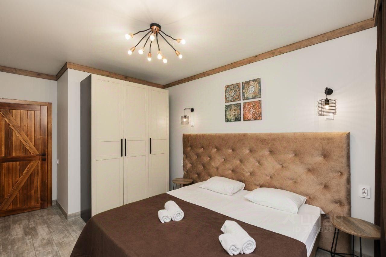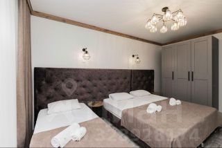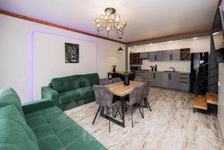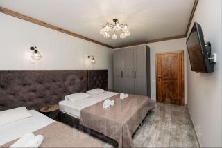 В спальнях: 5 односпальных кроватей (либо на выбор гостей одна двуспальная и 3 односпальных), шкаф, телевизор. На кухне обеденный стол, стулья, газовая плита, микроволновая печь, необходимая посуда. В кухне-столовой расположен раскладной диван.