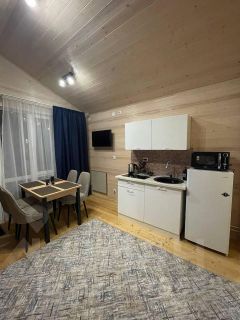 Для проживания гостям предлагаются 3 уютных домика. Домики вмещают от двух до шести человек. В домиках есть всё необходимое для комфортного отдыха. Спальня с комфортной двуспальной кроватью, мягкими воздушными одеялами и качественным постельным бельем. Гостиная с большим раскладным диваном, телевизором и Вай-фай. Кухня с нужной посудой, микроволновкой, плитой, холодильником, чайником, есть чай, кофе, сахар. Ванная комната со всеми необходимыми средствами гигиены - шампуни, гели для душа, зубные щетки и паста, мыло, шапочка для душа, тапочки, полотенца, фен. В каждом домике есть отопление, которое можно включать по желанию! Зимой домики очень теплые и комфортные!