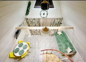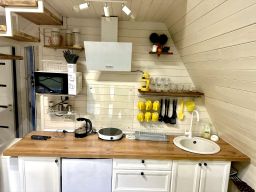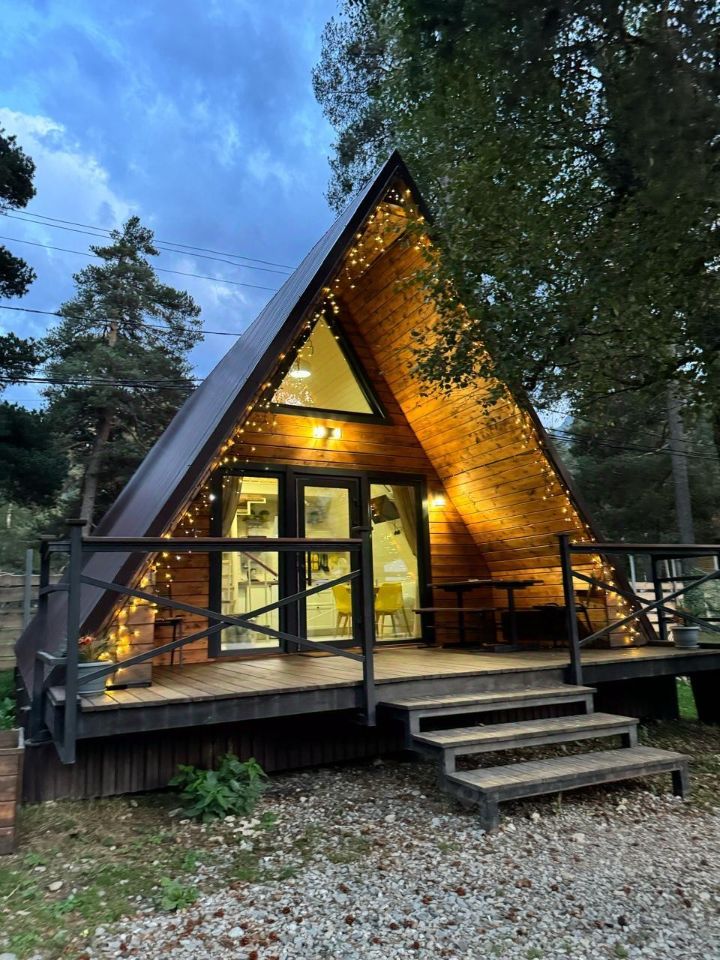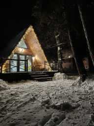 А-фрейм для 4 гостей. В доме комфортная ванная комната с душем. Кухня оборудована необходимой посудой и техникой. Полотенца и постельное белье предоставляется. На террасе мебель, рядом мангальная зона. Есть бойлер и телевизор.