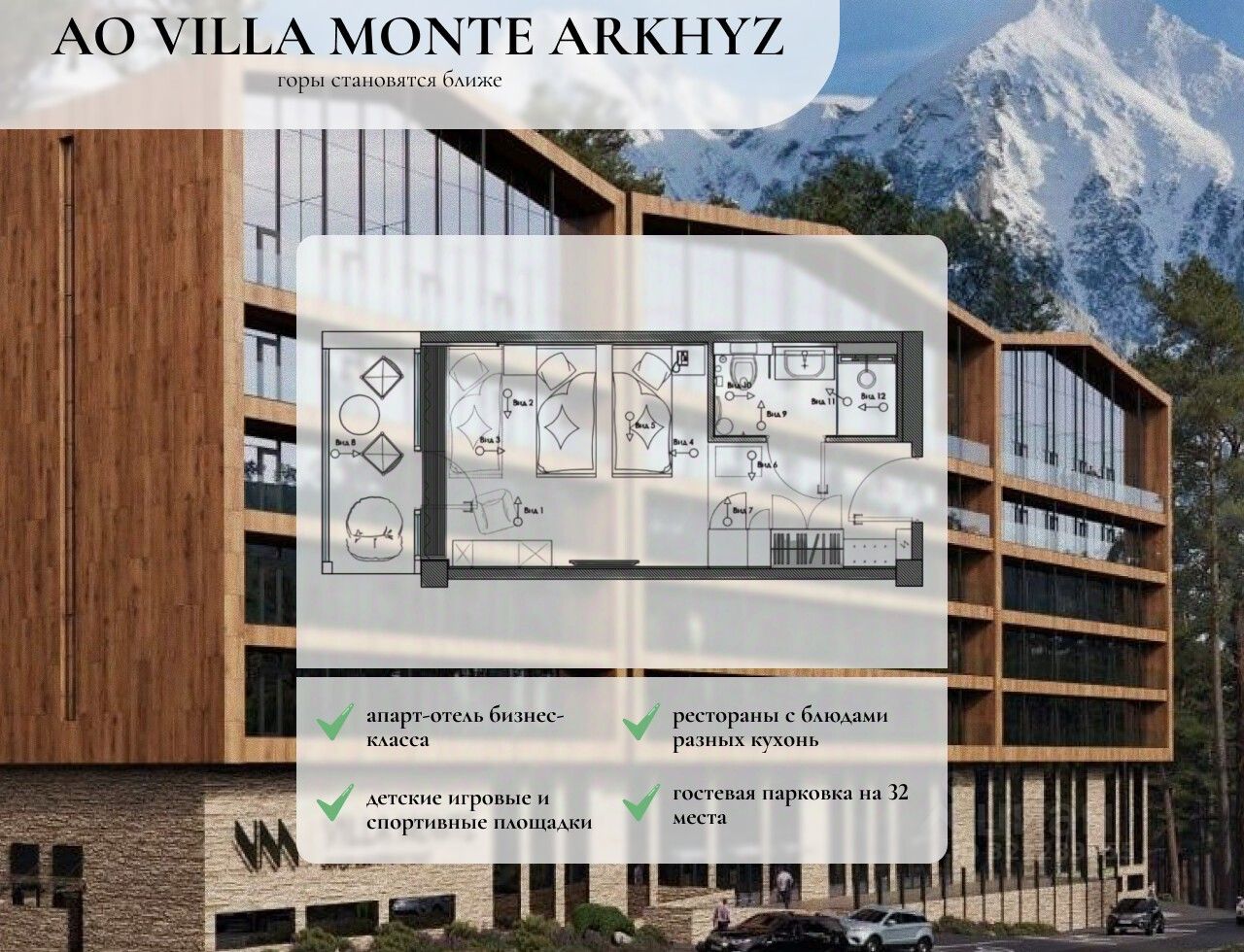 Высокодоходный апарт-отель в сердце Архыза. Отель - наполненный технологиями, с высоким уровнем комфорта и сервиса. Каждый номер — это готовый к сдаче актив под управлением, гарантированно приносящий стабильный доход с минимальным риском. VILLA MONTE — апарт-отель бизнес-класса, где каждая деталь продумана для удобства гостей. VILLA MONTE предлагает высокое качество строительства, использование современных материалов и технологий, а также продуманную планировку апартаментов. Апартаменты, которые подойдут для удовлетворения различных потребностей и предпочтений. Компактность и уют создают особую атмосферу спокойствия. До шести этажей. Такое решение обеспечивает комфорт и безопасность, позволяя жителям наслаждаться видом из окна и свежим воздухом. Для гостей предусмотрена гостевая парковка на 32 места. На территории комплекса будут организованы детские игровые и спортивные площадки. Также будет проведено озеленение. Социальные объекты на территории и поблизости: - рестораны с блюдами разных кухонь; - спа-салон; - магазин с необходимыми товарами для повседневной жизни. Все эти объекты находятся в шаговой доступности от дома. Дополнительные особенности: - инфраструктура для хранения и проката спортивного инвентаря; - система "умный дом" в квартирах позволяет управлять освещением, температурой и безопасностью на расстоянии.