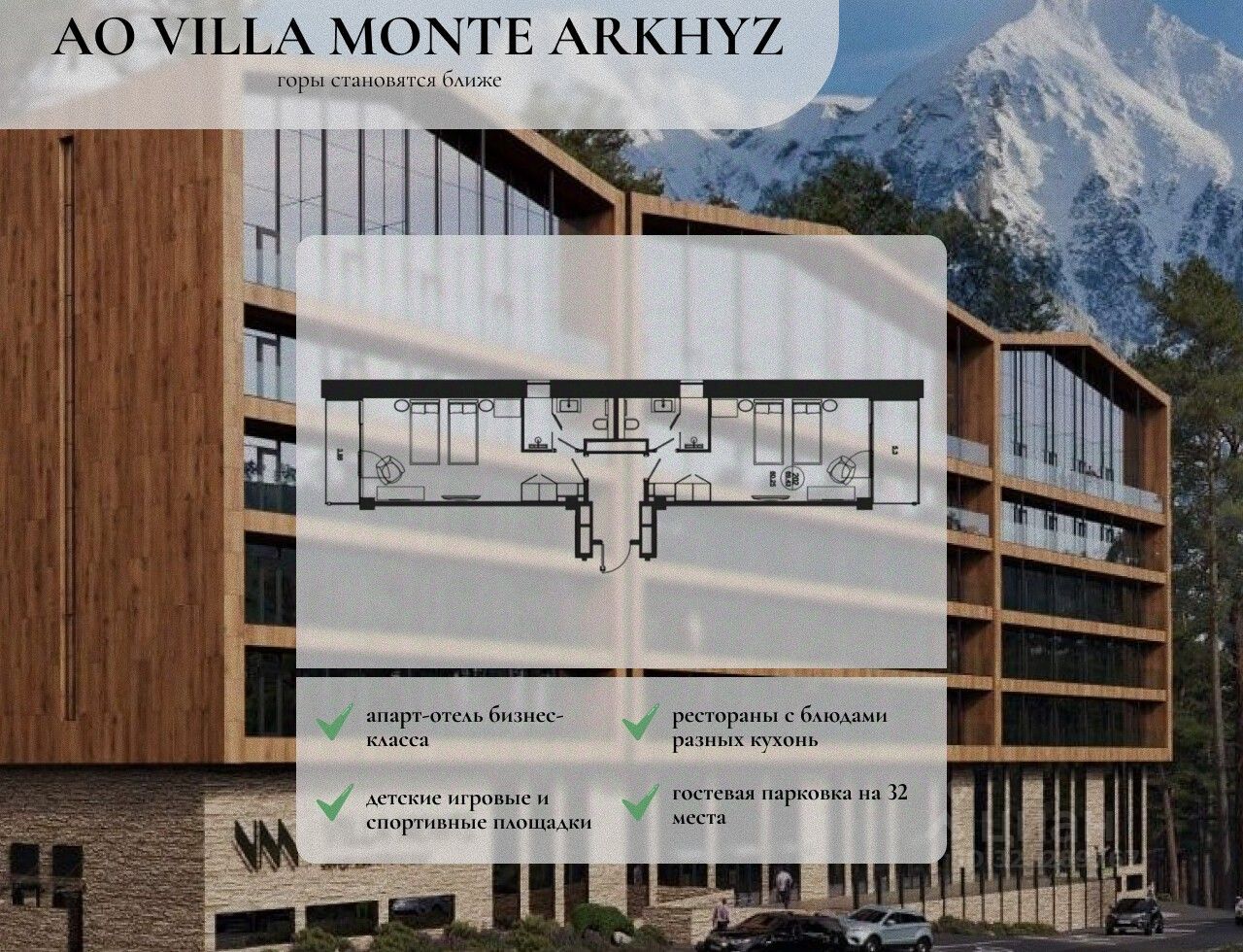 Высокодоходный апарт-отель в сердце Архыза. Отель - наполненный технологиями, с высоким уровнем комфорта и сервиса. Каждый номер — это готовый к сдаче актив под управлением, гарантированно приносящий стабильный доход с минимальным риском. VILLA MONTE — апарт-отель бизнес-класса, где каждая деталь продумана для удобства гостей. VILLA MONTE предлагает высокое качество строительства, использование современных материалов и технологий, а также продуманную планировку апартаментов. Апартаменты, которые подойдут для удовлетворения различных потребностей и предпочтений. Компактность и уют создают особую атмосферу спокойствия. До шести этажей. Такое решение обеспечивает комфорт и безопасность, позволяя жителям наслаждаться видом из окна и свежим воздухом. Для гостей предусмотрена гостевая парковка на 32 места. На территории комплекса будут организованы детские игровые и спортивные площадки. Также будет проведено озеленение. Социальные объекты на территории и поблизости: - рестораны с блюдами разных кухонь; - спа-салон; - магазин с необходимыми товарами для повседневной жизни. Все эти объекты находятся в шаговой доступности от дома. Дополнительные особенности: - инфраструктура для хранения и проката спортивного инвентаря; - система "умный дом" в квартирах позволяет управлять освещением, температурой и безопасностью на расстоянии.