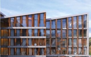 Фасады отделаны натуральными материалами: камнем, металлом и стеклом. Входные группы и коммерческие помещения на первом этаже имеют витражное остекление.