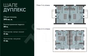 Шале, состоящее из двух половин, каждая из которых имеет отдельный вход. 192 кв.м жилой площади, балкон по периметру площадью 50 кв.м, 6 санузлов, 6 отдельных спален. Возможно приобрести 1 половину Дуплекса по цене 81 500 000 руб.
