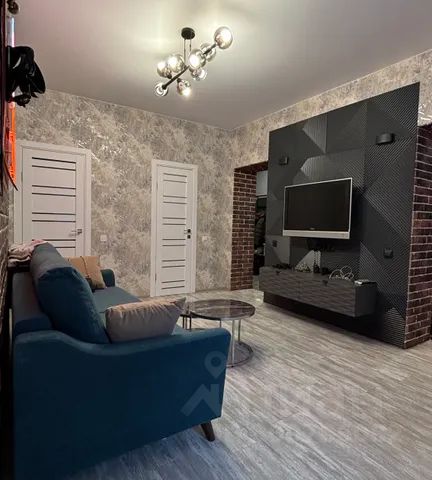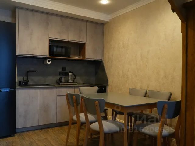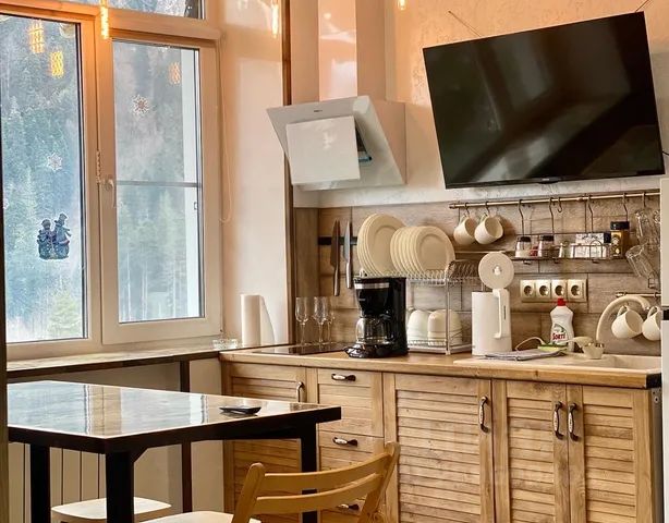 Гостиная совмещена с кухонной зоной, на кухне есть электрическая плита ,СВЧ ,духовой шкаф ,посуда для приготовления пищи,предусмотрено все для комфортного пребывания. В гостиной также имеется раскладной двуспальный диван,комод ,журнальный столик ,стол тумба под телевизор ,телевизор