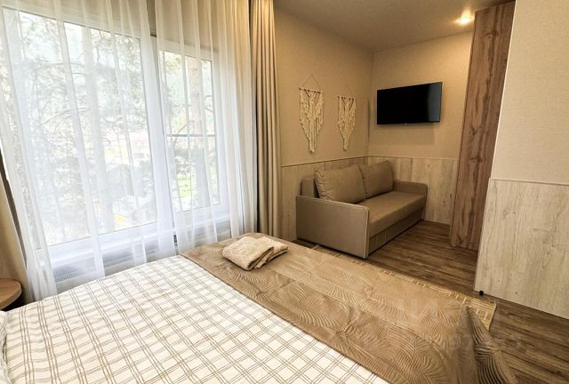Апартаменты Делюкс обустроены большой кроватью, удобным диваном, плоским телевизором, ванной комнатой с душем, туалетом, раковиной, зеркалом, а также средствами личной гигиены и набором полотенец. Кухня оборудована плитой, электрическим чайником, микроволновой печью, холодильником, а также столовыми приборами, посудой, обеденным столом и стульями.