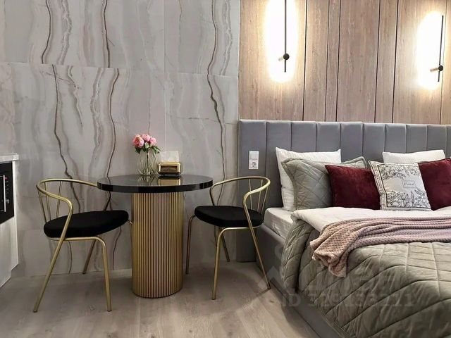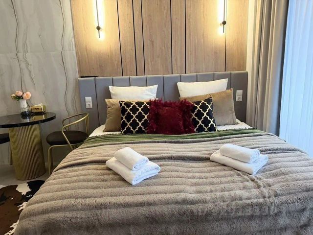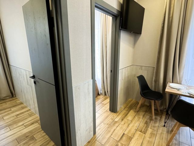 В апартаментах есть две спальни и гостиная, в которой располагается кухня, обеденная зона и мягкий диван для отдыха. Могут разместиться до 6 человек: