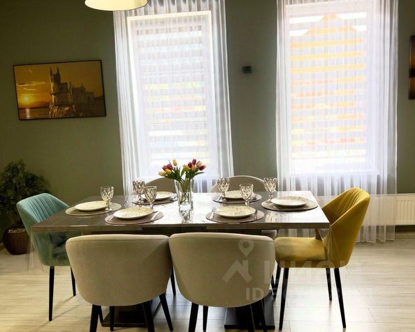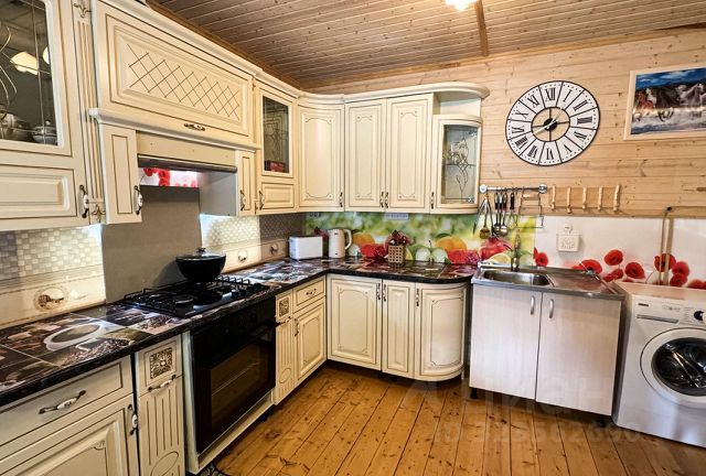 В кухне: тостер, электрочайник, Smart TV, wi-fi, холодильник, стиральная машина, микроволновая печь, газовая плита с духовкой, вытяжка, посуда, раковина, кухонный гарнитур, обеденный стол и стулья, окна