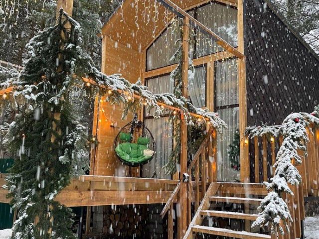"A-frame (тандем) состоит из 2 больших домов и соединен гостиной с видом на горы. Подходит для размещения 8-10 человек (с учетом дополнительных мест). В доме (тандем): 2 двуспальных дивана, на втором ярусе 4 односпальные кровати. Имеются 2 кухни со всей необходимой техникой,2 телевизора, шкафы, вешалки, комоды, 2 обеденных стола с 8 стульями и большая гостиная с отдельным входом. Индивидуальные 2 сан. узла с душевыми кабинами и туалетом. В стоимость входит: Постельное бельё, полотенца, мыло, ванные принадлежности (Шампунь, Гель для душа, Мыло, Зубной набор). WI-Fi бесплатно на всей территории. Бесплатно: Крытая парковка, мангальная зона с мангалами и казаном. Закрытая веранда для отдыха и мероприятий у костра, ТРАНСФЕР до места катания и помощь в прокате снаряжения."