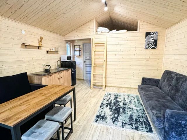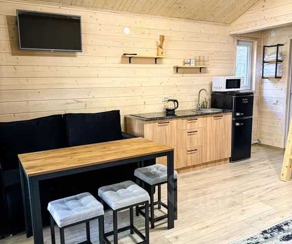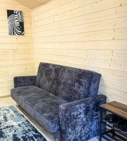 Для комфортного проживания гостей дом оснащен всем необходимым. В доме есть кухня-гостиная: стол, стулья, двуспальный диван, микроволновая печь, холодильник, колонка, вся