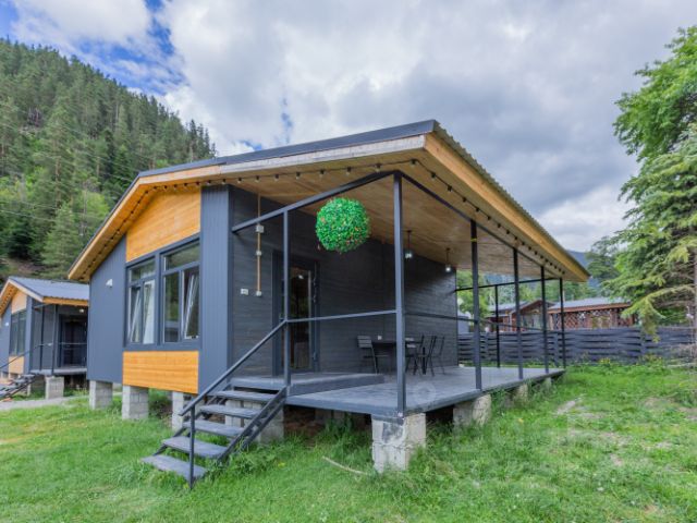 На территории: мангальная зона у каждого домика, качели, детская площадка, большая беседка, парковка.
