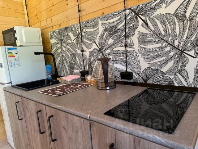 Для комфортного проживания гостей дом оснащен всем необходимым. В доме есть кухня-гостиная: стол, стулья, двуспальный диван, микроволновая печь, холодильник, колонка, вся