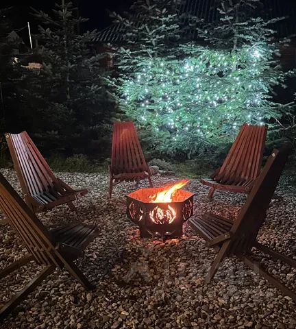 В каждом доме - терраса с садовой мебелью где можно посидеть, пообщаться и попить чай. На территории есть мангал с решеткой, шампурами, беседки, кострище и парковка для гостей.