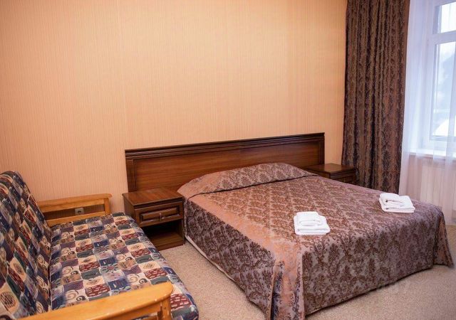 Отель в поселке Домбай с прямым доступом к подъемникам канатной дороги "1636 м". В 1,8 км от отеля находится водопад "Чертова мельница", а в 3 км — достопримечательность Кладбище альпинистов. Расстояние до города Таберда составляет 19 км, а до аэропорта Минеральных Вод — 217 км. Номера оформлены в классическом стиле и оснащены всем необходимым для комфортного отдыха. Гостям предоставляются туалетно-косметические принадлежности, халаты и тапочки. Каждое утро сервируется вкусный завтрак в формате "шведский стол". Вкусно пообедать или поужинать можно в ресторане. В меню есть бургеры, пицца, роллы, салаты, мясные и рыбные блюда из свежих и тщательно отобранных продуктов. На всей территории работает Wi-Fi. Гости могут заказать экскурсию по окрестностям. В сезон катания работает камера для хранения и сушки инвентаря. Возле отеля расположена вместительная охраняемая парковка для автомобилей. Стандарт Улучшенный без балкона площадью 38 кв.м. с видом на горы. Идеально подходит для размещения 2 человек. Имеет спальню с приятным интерьером. В номере:1 двуспальная кровать и двуспальный диван. Имеется телевизор,чайник, отопление, шкаф, вешалка для одежды, комод и обеденный стол. В ванной комнате находится душ, туалет и раковина, ванные принадлежности,халат,тапочки,фен. В стоимость входит: Постельное бельё, полотенца, WI-Fi бесплатно на всей территории. Парковка - за территорией, охраняемая."