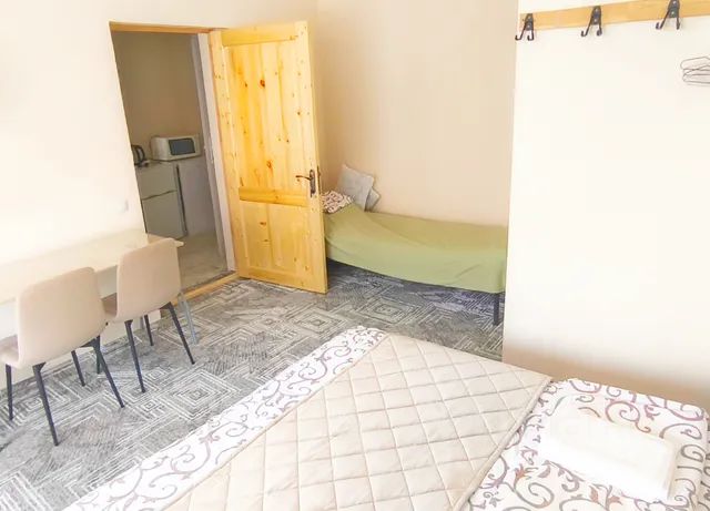 Номер с балконом Дорогие гости, сдаю мансардный дом на втором этаже, или "дом на крыше". ( 2-3 местное размещение ) У мансарды отдельный вход со двора, своя территория На первом этаже есть кафе с национальной кухней. 5 раздельных, одинаковых по интерьеру комнат со всеми удобствами в каждой ( душ, сан узел, телевизор, фен, бельё ). Оборудованная кухня. Закрытая территория, парковка, двор, мангал, беседка. Идеальный вариант для нескольких семей. Рядом: Баня, кафе, магазины, аптека, остановка, пекарня в шаговой доступности. Мухинское ущелье, лес в шаговой доступности. Национальный парк, (заповедник ) 2 минуты на машине Озеро Кара-Кель 5 минут на машине До домбая 20 минут на машине