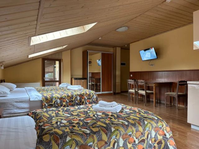 Трёхместный номер площадью 25 кв.м с видом на улицу и двор. Подходит для размещения 3 человек. Имеет спальню с приятным интерьером. В номере: 1 двуспальная кровать king-size, 1 односпальная кровать. Имеется телевизор, отопление, шкаф, вешалка, зеркало, журнальный столик, чайник, холодильник, минибар, стулья. Индивидуальная ванная комната: душ, раковина, туалет, фен. В стоимость входит: Постельное бельё, полотенца, мыло, халат, тапочки, шампунь, гель для душа, кондиционер. WI-Fi бесплатно на всей территории. Бесплатная частная парковка под видеонаблюдением на территории. Гостевой дом "Golden House" расположен в самом сердце Теберды, всего в нескольких минутах от живописного озера "Кара-Кёл", в 5 минутах Джамагатское ущелье, Биосферный заповедник, в 15мин горнолыжный курорт Домбай. "Golden House" - это идеальное место для тех, кто ищет умиротворение и комфорт в окружении живописной природы . Размещение: Мы предлагаем уютные номера различных категорий, оборудованные всем необходимым для комфортного проживания. В каждом номере есть удобные кровати, телевизор, холодильник, чайник, бесплатный Wi-Fi и собственная ванная комната с душем . Удобства: - бесплатный Wi-Fi - кафе с домашней кухней - баня - мангальная зона - бильярд - парковка - незабываемый вид на горы