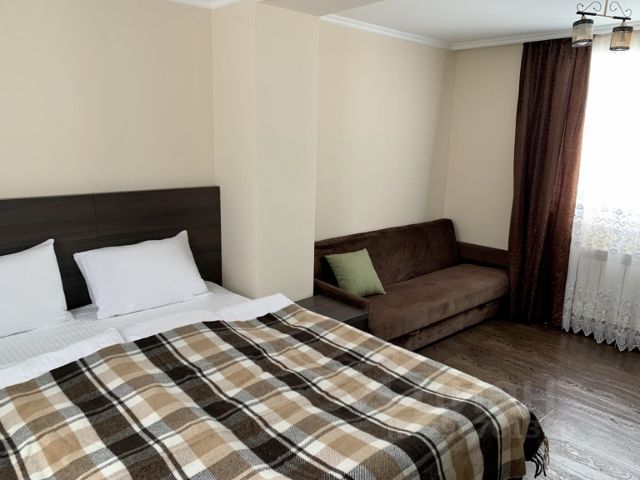 Номер категории Стандартный, вмещает двоих гостей. В номере большая двуспальная кровать, рабочая зона, прикроватные тумбы и дополнительное освещение, душевая, постельное белье, полотенца и фен, современный телевизор с плоским экраном. Зимой включается подогрев полов в душевой. Во всех номерах бесплатный WiFi. На территории отеля имеется Мангальная зона и Русская баня. На первом этаже функционирует кафетерий.