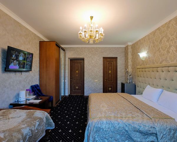 Трёхместный номер площадью 25 кв.м с видом на улицу и двор. Подходит для размещения 3 человек. Имеет спальню с приятным интерьером. В номере: 1 двуспальная кровать king-size, 1 односпальная кровать. Имеется телевизор, отопление, шкаф, вешалка, зеркало, журнальный столик, чайник, холодильник, минибар, стулья. Индивидуальная ванная комната: душ, раковина, туалет, фен. В стоимость входит: Постельное бельё, полотенца, мыло, халат, тапочки, шампунь, гель для душа, кондиционер. WI-Fi бесплатно на всей территории. Бесплатная частная парковка под видеонаблюдением на территории. Гостевой дом "Golden House" расположен в самом сердце Теберды, всего в нескольких минутах от живописного озера "Кара-Кёл", в 5 минутах Джамагатское ущелье, Биосферный заповедник, в 15мин горнолыжный курорт Домбай. "Golden House" - это идеальное место для тех, кто ищет умиротворение и комфорт в окружении живописной природы . Размещение: Мы предлагаем уютные номера различных категорий, оборудованные всем необходимым для комфортного проживания. В каждом номере есть удобные кровати, телевизор, холодильник, чайник, бесплатный Wi-Fi и собственная ванная комната с душем . Удобства: - бесплатный Wi-Fi - кафе с домашней кухней - баня - мангальная зона - бильярд - парковка - незабываемый вид на горы