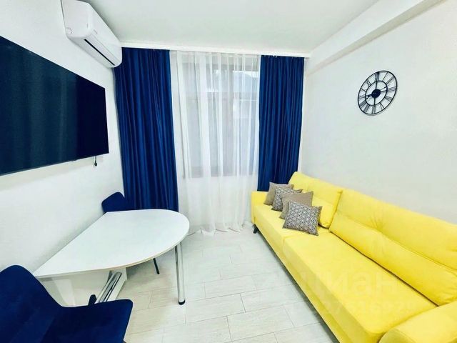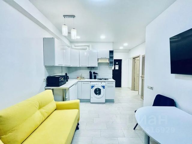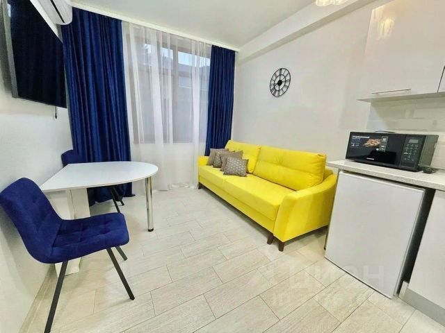 - первая комната сделана студией, где имеется кухня, посуда из расчета на шесть человек, чайник, холодильник, микроволновая печь, стол, стулья, телевизор, раздвижной диван, бра, прикроватная полочка.