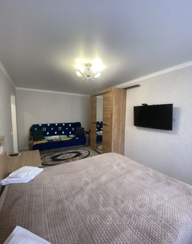 Сдается для проживания однокомнатная, уютная квартира на первом этаже. В наличии два двуспальных места. В квартире спальные принадлежности, телевизор, беспроводной интернет. Кухня полностью укомплектована всем необходимым Стоянка для автомобилей во дворе. Сдаётся исключительно для гостей республики, мероприятия запрещены. Ограничений по размещению с детьми нет, с животными и велосипедами запрещено. Заселение до 21:00