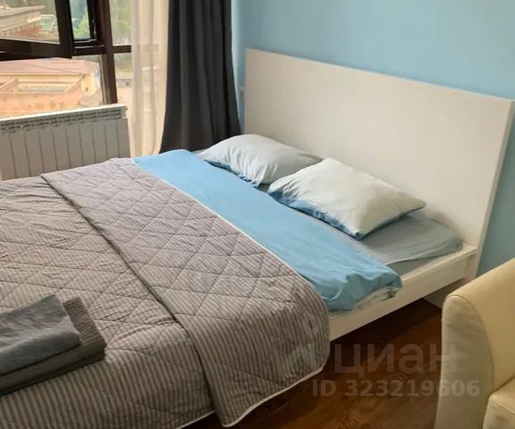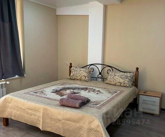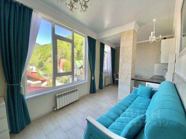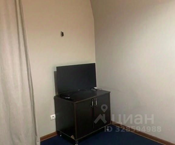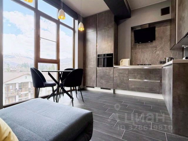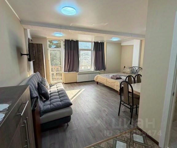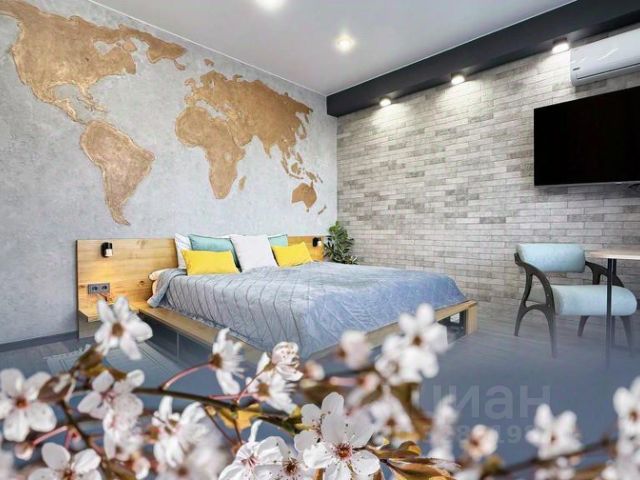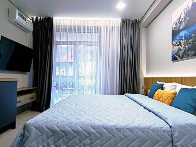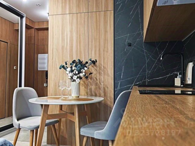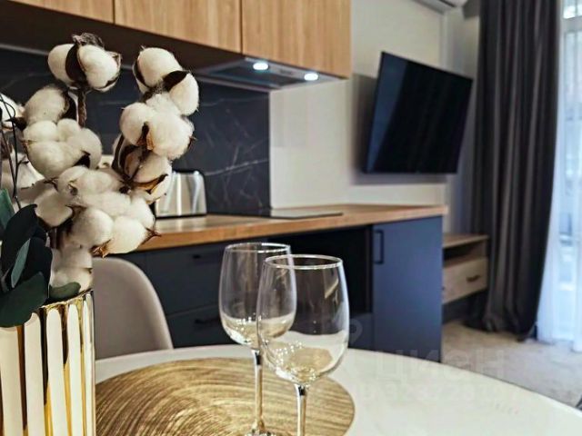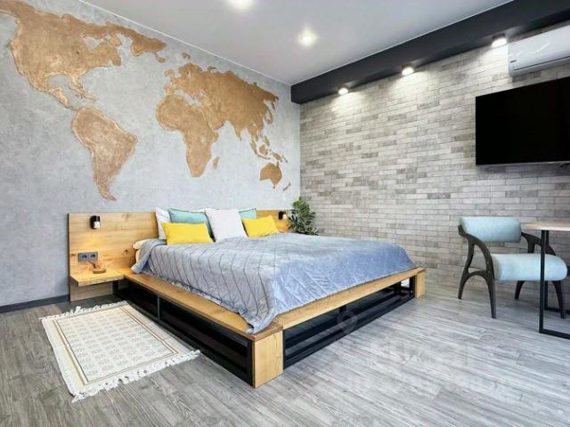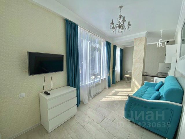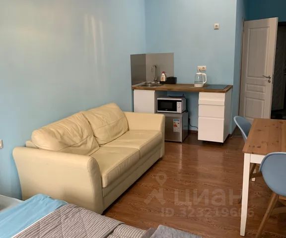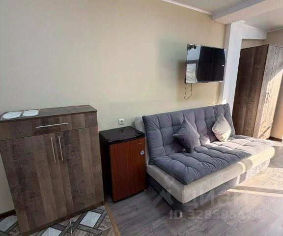 - первая комната сделана студией, где имеется кухня, посуда из расчета на шесть человек, чайник, холодильник, микроволновая печь, стол, стулья, телевизор, раздвижной диван, бра, прикроватная полочка.