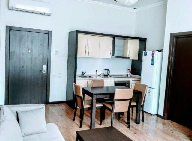 - первая комната сделана студией, где имеется кухня, посуда из расчета на шесть человек, чайник, холодильник, микроволновая печь, стол, стулья, телевизор, раздвижной диван, бра, прикроватная полочка.