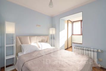 Спальня: большая двуспальная кровать, шкаф, прикроватные тумбы, комод. Спальня очень тихая, окна выходят в закрытый двор. Часть спальной отделена под душевую зону с раковиной (обратите внимание, что душевая не в отдельной комнате!).