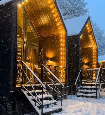 Для размещения предлагаются домики из натурального дерева типа A-frame и бaрнxаус. Домики оборудованы звукоизоляцией и оснащены отоплением с теплым полом. Внутри есть все необходимое для комфортного отдыха, в том числе полностью оборудованная кухня с современной бытовой техникой и красивой посудой для самостоятельного приготовления пищи. Коттеджи оснащены продуманной системой освещения, создающей атмосферу уюта. Гостям предлагаются халаты и тапочки, а также туалетно-косметические принадлежности.