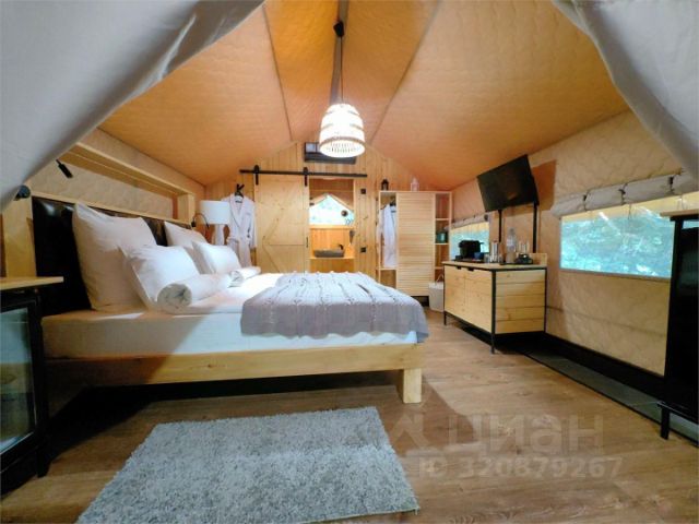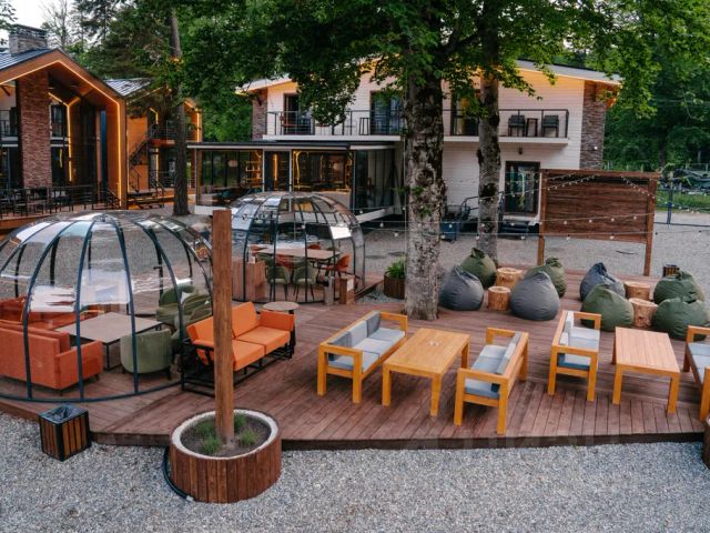 Также гости могут забронировать современные домики вместимостью от 2 до 14 гостей с индивидуальным отоплением: треугольные "А-фреймы", многокомнатные "Шале", 2-этажные "Бунгало" c 3-мя спальнями, 3-этажный дом "Премиум" с камином. Все дома оснащены полностью оборудованной кухней с обеденной зоной, всей необходимой мебелью и собственной террасой.